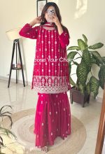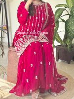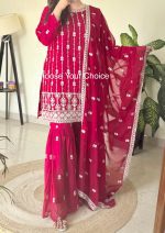 Sharara 3-Piece Sequin Embroidery Suit – A stylish and elegant ensemble featuring a sequin-embroidered kurta, flared sharara, and matching dupatta. Perfect for festive and wedding occasions.